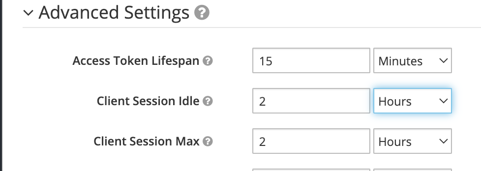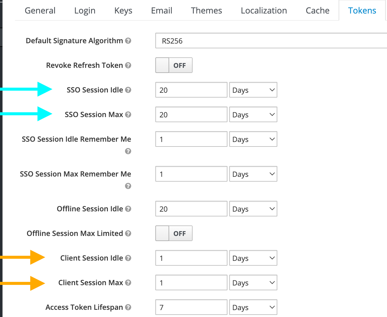 Access Token Lifespan is the time to live for the access token; “Client Session Idle“ is the allowed time to be inactive before session dies and “Client Session Max“ is the maximum time to live from access token. The refresh token time is the minimum between Clients fields.